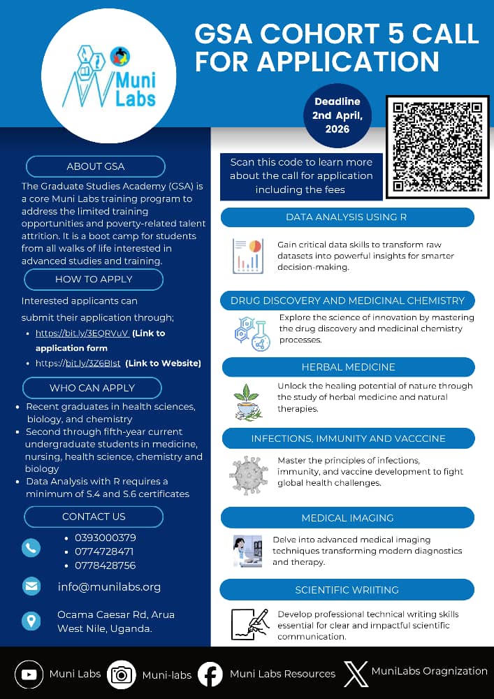 MUNI Labs is a local NGO established in 2017 to mobilize support for rural health capacity in partnership with Muni University. Muni Labs is happy to announce the Graduate Studies Academy (GSA), a preparatory training program for advanced studies. The GSA is uniquely tailored to each student to maximize their chances of success in their desired careers in Uganda, Africa, and globally. It is a preparatory service but not a formal academic program.